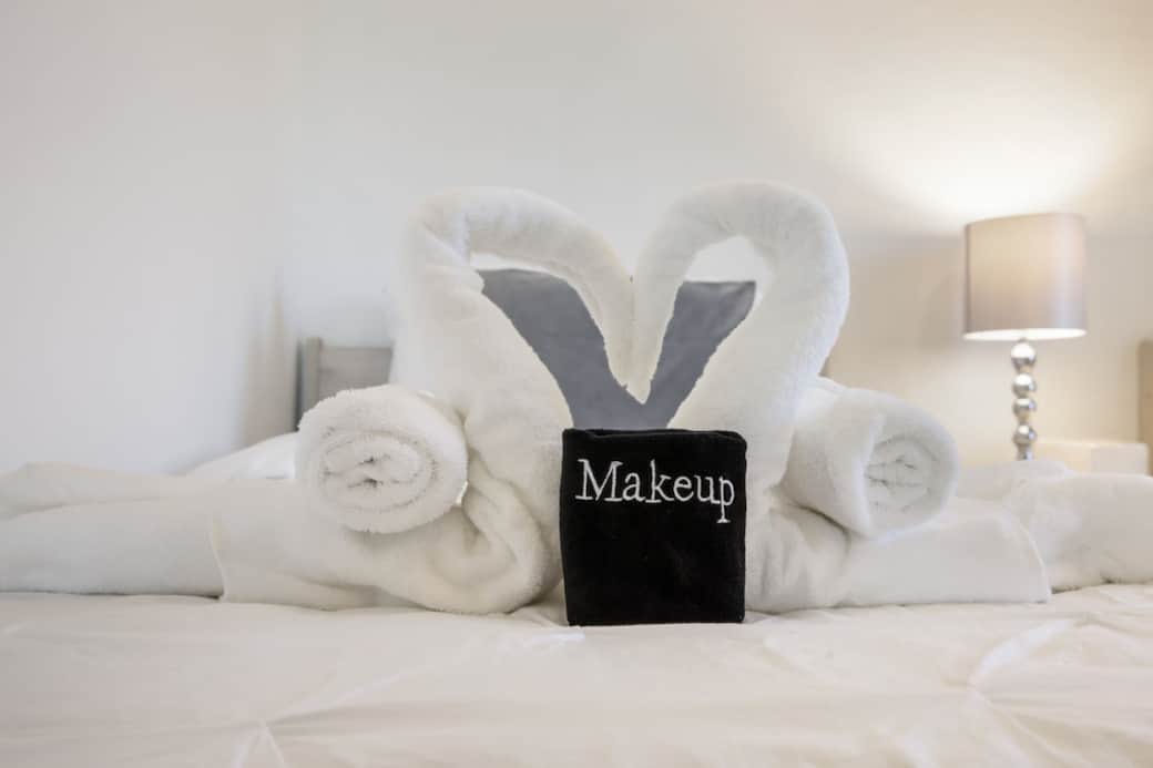 Relax in the luxurious master bedroom with plush bedding"